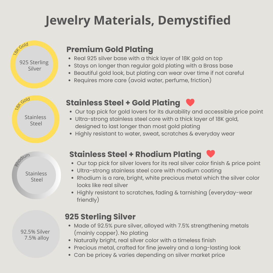 Our stainless steel is a premium durable, tarnish-resistant metal that’s perfect for everyday wear. It does not fade, rust, or oxidize, making it a reliable choice for long-lasting jewelry at an affordable price. Additionally, it is hypoallergenic and gentle on the skin, it’s safe for all skin types.